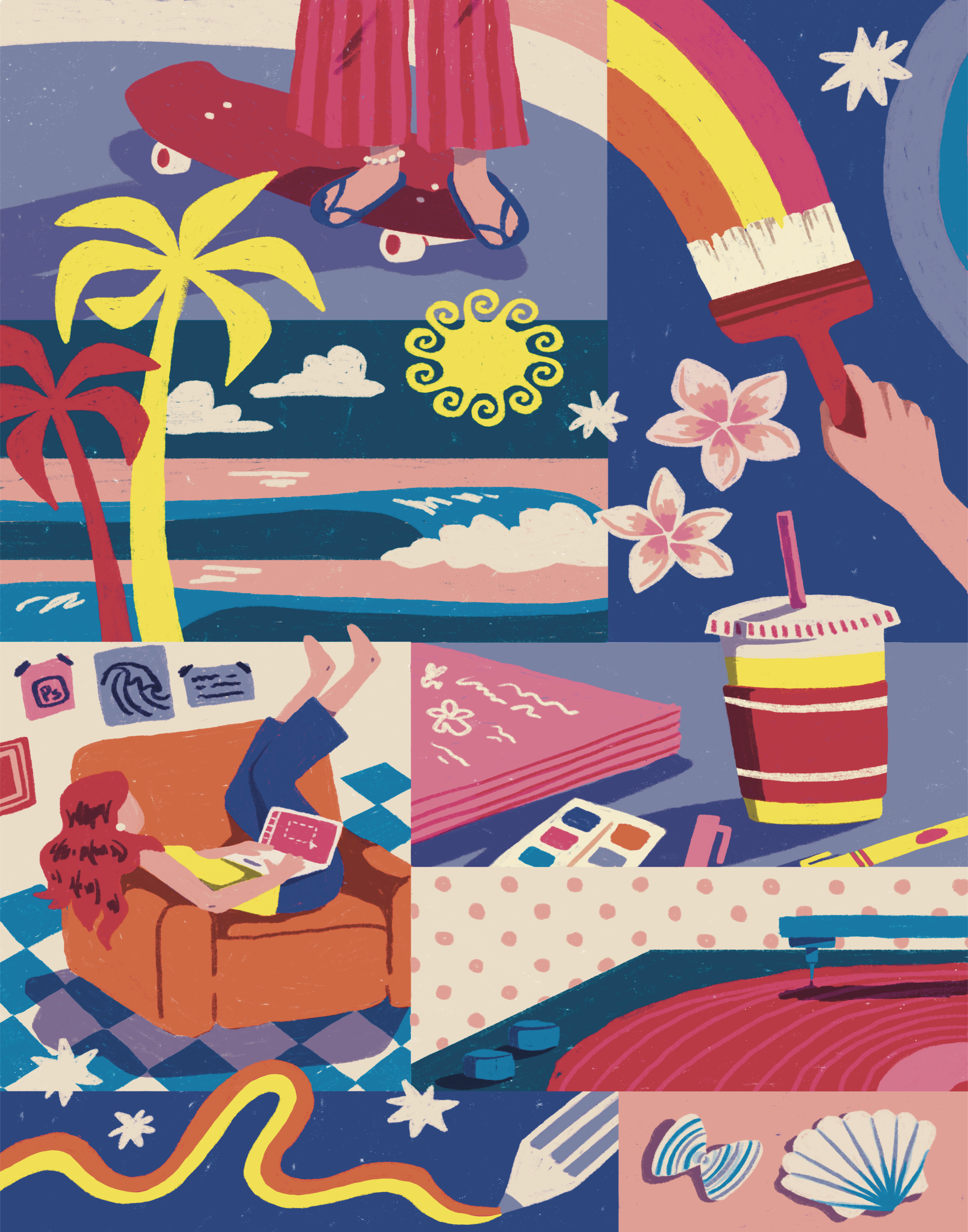 Illustrated packaging design including a box, notebook, candle, and mug, as well as various social media banners, posts, and templates.